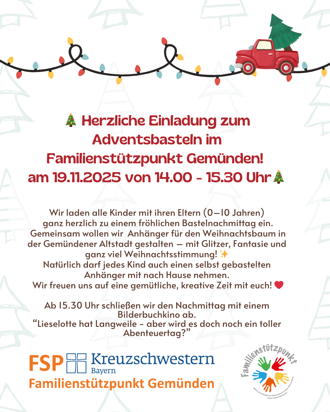Gemeinsam wollen wir Anhänger für den Weihnachtsbaum in der Gemündener Altstadt gestalten – mit Glitzer, Fantasie und ganz viel Weihnachtsstimmung! Natürlich darf jedes Kind auch einen selbst gebastelten Anhänger mit nach Hause nehmen. Wir freuen uns auf eine gemütliche, kreative Zeit mit euch!